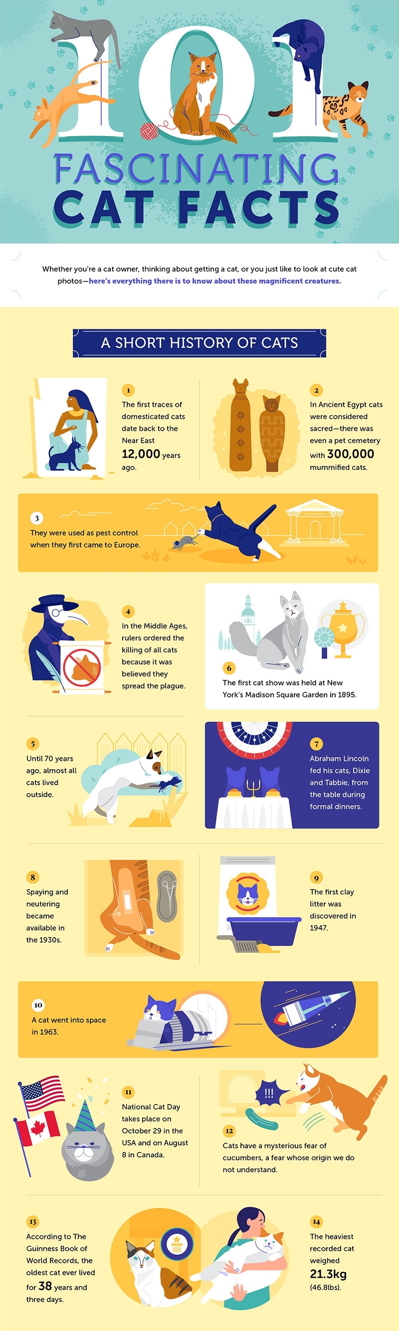 Cats are magnificent creatures! Did you know a cat went into space in 1963? Neither did we! Here are 101 intesting cat facts.